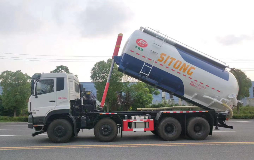 *產品全稱:東風天龍前四后八立式干混砂漿運輸車(國六)