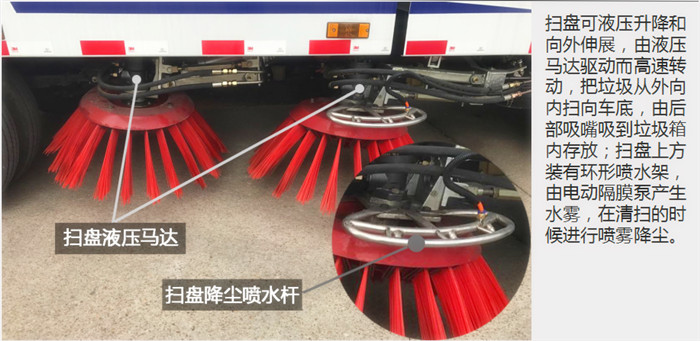 駕駛室電液集中控制,操作方便;掃盤有防碰撞 自動避讓功能,可根據(jù)地面泥沙嚴重程度及行車速度選擇掃盤的清掃方式;吸嘴為后置浮動式,可自動調節(jié)適應地面凹凸不平的狀況;可調節(jié)的霧狀噴灑水壓塵,在節(jié)水的同時消除二次污染。
