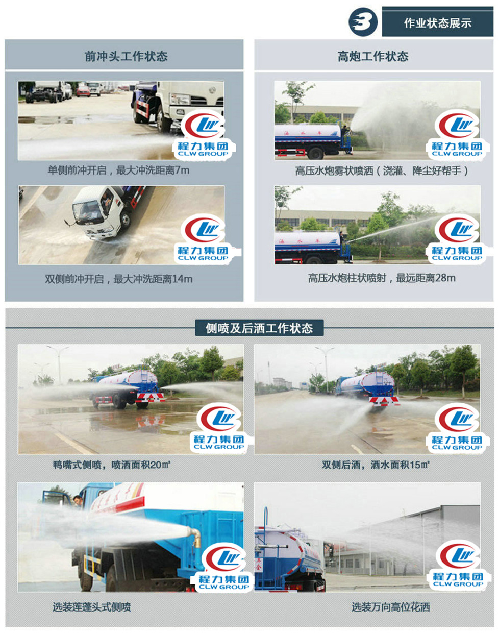 該車具有免征公告(可免交車輛購置稅)。罐體采用武鋼5mm優質碳鋼板一次卷壓成型,完全做到無縫成型。罐設多道防波隔板,采用高壓氣體試漏檢測,使罐體具有強度高,重心穩,車輛運載平穩。罐體外表為烤漆,罐體及各杠貼紅白色視覺反光條,罐體兩側噴“綠化灑水車”字樣(可按您的要求噴繪字樣),罐體顏色出廠為上白下綠或上白下藍(可按您的要求噴繪顏色)。