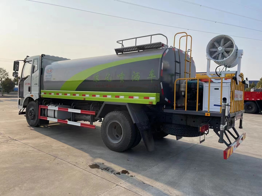 解放12-15噸多功能灑水車整車配置:解放J6車身,大柴225馬力渦輪增壓發動機,法士特8檔變速箱,前橋5噸,后橋10噸;當選用4000mm軸距時,罐體容積為12噸;當選裝4500軸距時,罐體容積為15立方;10.00R20后雙輪鋼絲胎,氣囊減震座椅;原廠自動冷暖空調,中控門鎖,電動門窗,DIN北斗兼容車載系統。罐體4mm厚武鋼專用罐式板制作,實際容積15立方,罐內加裝隔板具有防波作用,以減低汽車行駛時罐體液體的沖擊。大功率杭州威龍水泵;泵進泵出;DN80主出水管,消防栓接口,前沖、后灑、側噴、后工作平臺帶綠化水炮,垂直吸程≧7米,灑水寬度≧14-18米,射程≧20-25米,引水時間<5min,流量90m3/h。鍍鋅沖孔后工作平臺帶30米S彎高壓水炮,全車316不銹鋼大通徑球閥;自流閥、不銹鋼濾網、帶自吸自排功能。兩根等長輸水管,電泳金屬漆,其余標配。整車螺栓鉚接,大梁不動焊;可選裝非車帶泵動力不銹鋼罐體等。