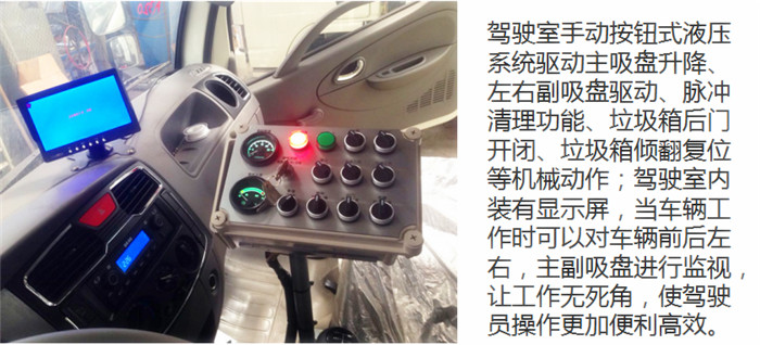 2.操縱便捷。只需要通過駕駛室內的控制面板就可方便的操作副發動機啟動和熄火、風機轉速升降、吸塵口升降、后門開關、箱體升降,灑水開關。
